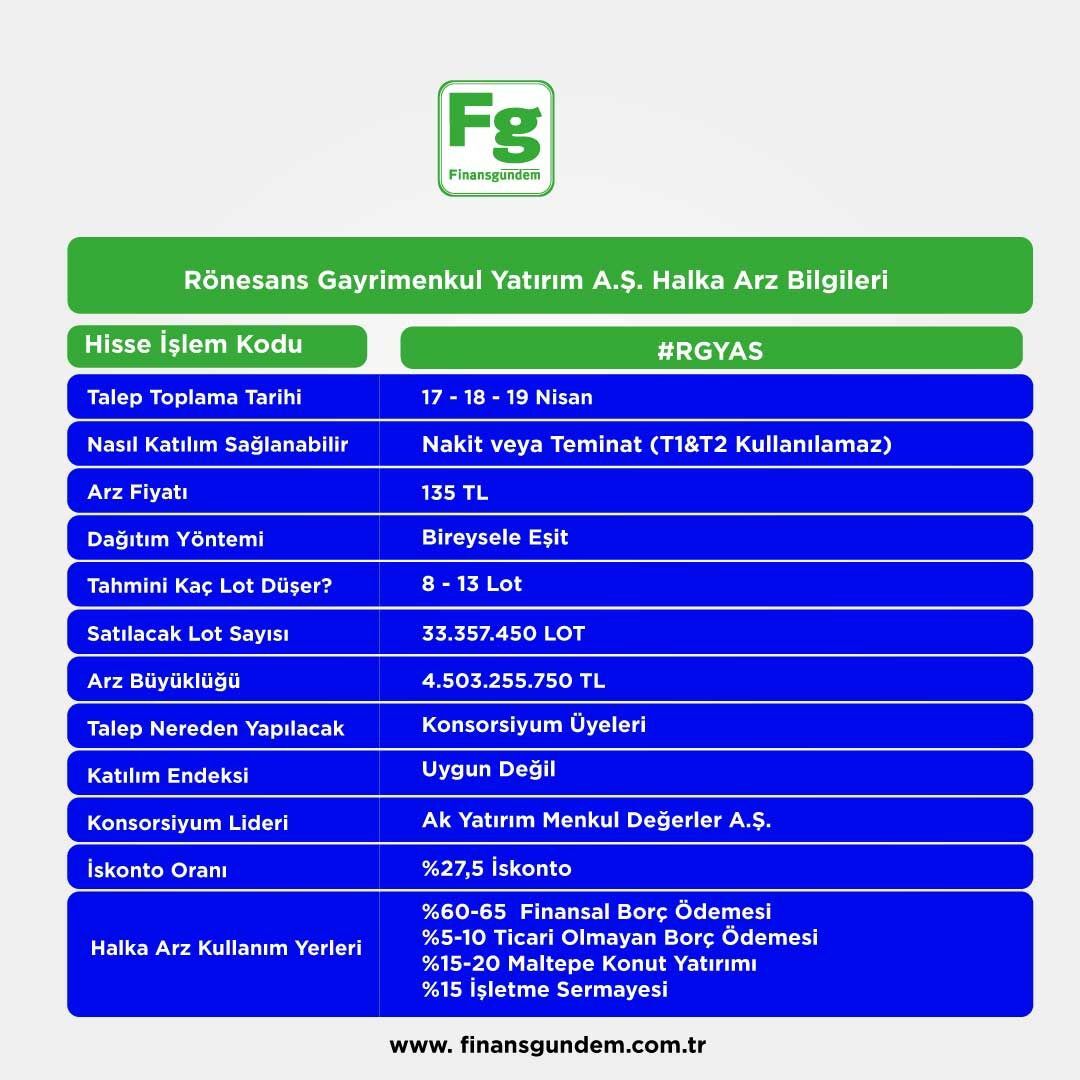 Fiyat istikrarına 1.1 milyar TL kaynakPay başına 135 liradan halka arz edilecek payların yüzde 80’i yurt içi bireysel yatırımcılara, yüzde 20’si ise yurt içi kurumsal yatırımcılara tahsis edildi. Toplam 4,5 milyar TL büyüklüğündeki halka arzın gerçekleşmesi ile şirketin halka açıklık oranı yüzde 10,08 olacak. Rönesans Gayrimenkul Yatırım hisselerinin Borsa İstanbul’da işlem görmesiyle birlikte halka arz büyüklüğünün yüzde 25’ine karşılık gelen ve Rönesans Holding tarafından sağlanacak kaynak ile fiyat istikrarı işlemleri yapılacak. Bu kapsamda 30 gün süreyle, Deniz Yatırım aracılığı ile toplam 1,1 milyar TL tutarındaki kaynak kullanımda olacak.