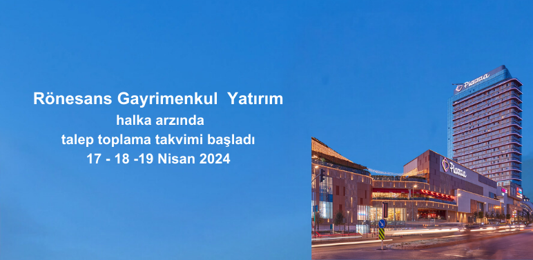 Rönesans Holding’in Türkiye’deki ticari gayrimenkul geliştirme ve yatırım şirketi Rönesans Gayrimenkul Yatırım halka açılıyor. Optimum, Hilltown ve Piazza gibi zincir AVM markalarının yatırımcısı ve işletmecisi olarak Türkiye’nin 7 şehrinde faaliyet gösteren Rönesans Gayrimenkul Yatırım AŞ halka arzı için Ak Yatırım ve Deniz Yatırım’ın konsorsiyum liderliğinde 17- 18-19 Nisan’da talep toplanacak. Yaklaşık 740 bin metrekarelik brüt kiralanabilir alana sahip şirket, nominal değeri 33 milyon 357 bin 450 TL olan paylarını halka arz edecek.