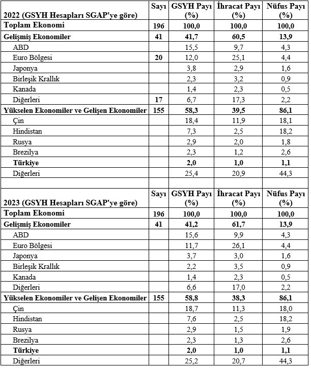 Dikkati çeken ilk husus gelişmiş ekonomilerin dünya GSYH’sindeki payı hafifçe gerilerken gelişme yokundaki ekonomilerin payının hafifçe artmasıdır. İkinci olarak ABD’nin GSYH’deki payının artmasına karşılık Euro Bölgesinin payındaki gerileme dikkat çekicidir. Üçüncü önemli nokta Çin ve Hindistan’ın paylarının artmaya devam etmesidir. Türkiye’nin görünümünde bir değişiklik yoktur.