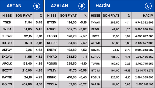 Borsa İstanbul’da endeks 100’de 15 Ağustos 2024 işlem gününde en çok artan, en çok azalan ve en çok işlem hacmi gerçekleşen 10 hisse şöyle: