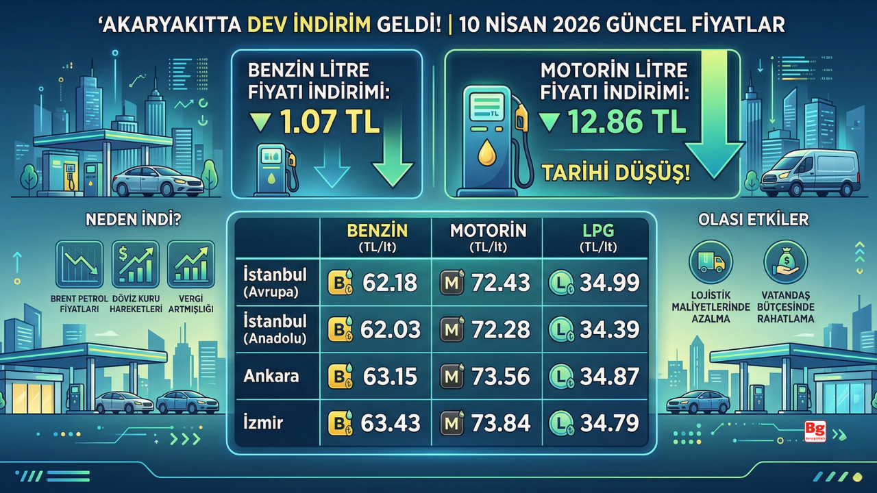 Akaryakıt fiyatlarında indirim pompaya yansıdı. Benzin litre fiyatında 1 lira 7 kuruş, motorin litre fiyatında ise 12 lira 86 kuruş düşüş gerçekleşti. Böylece 10 Nisan 2026 itibarıyla İstanbul, Ankara ve İzmir'de güncel akaryakıt fiyatları yeniden şekillendi.