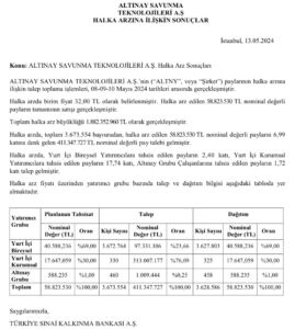 Altınay savunma halka arz sonuçları açıklandı. Toplam halka arz büyüklüğü 1.882.352.960 TL olarak gerçekleşmiştir.