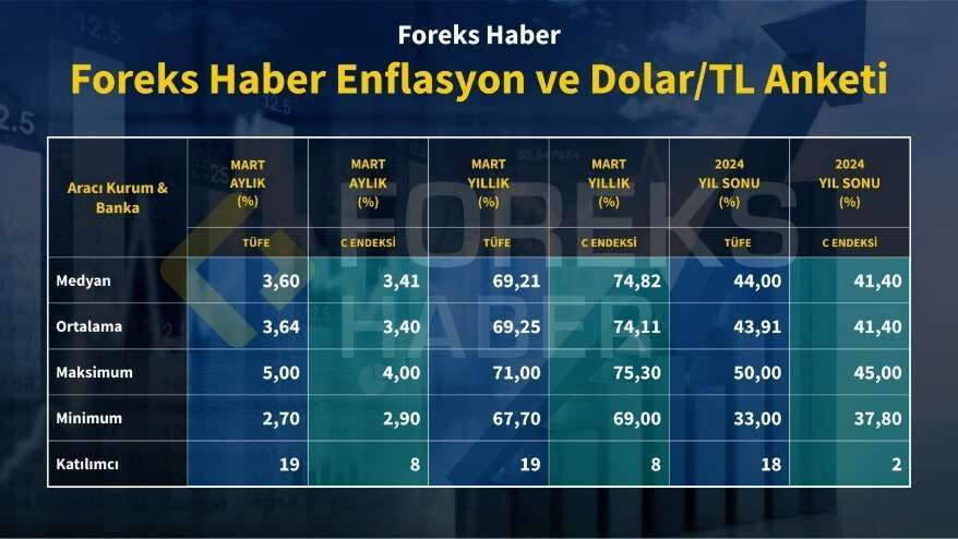 https://www.foreks.com/haber/detay/65ddd2cb46e0fb0001a5e151/PICNEWS/tr/foreks-haber-enflasyon-ve-dolar-tl-anketi-sonuclandi/ Banka ve aracı kurumların enflasyon verisine ilişkin yorumları şöyle: -Enflasyon Verisi(Vakıfbank) https://news-files.foreks.com/attachment/1712132023285_VakfBankMakroAnalizEnflasyonMart2024.pdf -Enflasyon Verisi(Yapı Kredi Yatırım) https://news-files.foreks.com/attachment/1712134103242_e7117c19-a5c9-499d-b866-2791f69f2f0a.pdf