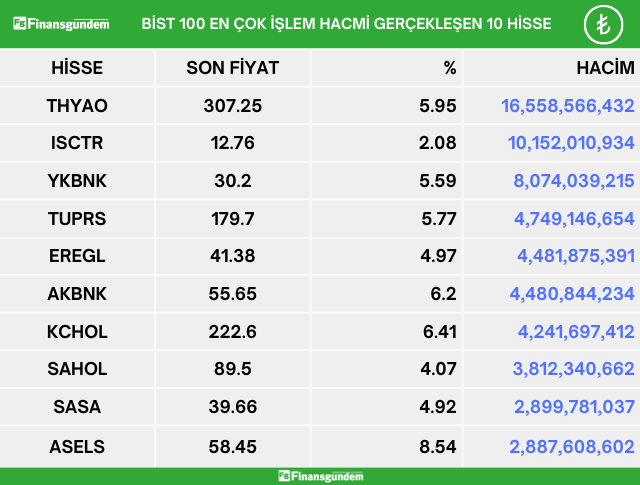 Bist 100’de bugün, sadece Batı Çimento hisse senedi günü %0,77 düşüşle kapattı. Borsa İstanbul endeks 100 de işlem gören hisselerden en çok artan ve en çok işlem hacmi gerçekleşen 10 hisse şöyle:ü