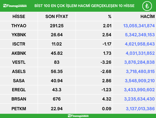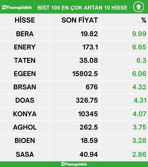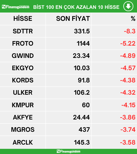 Borsa İstanbul endeks 100 de işlem gören hisselerden en çok artan, en çok azalan ve en çok işlem hacmi gerçekleşen 10 hisse şöyle: