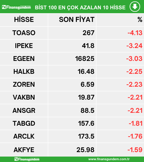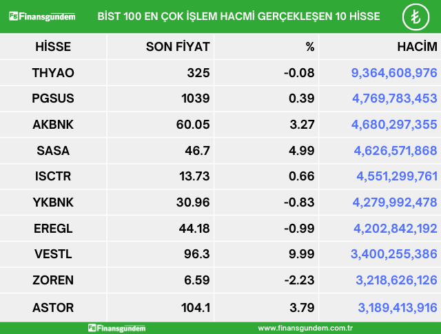 Borsa İstanbul endeks 100 de işlem gören hisselerden en çok artan, en çok azalan ve en çok işlem hacmi gerçekleşen 10 hisse şöyle: