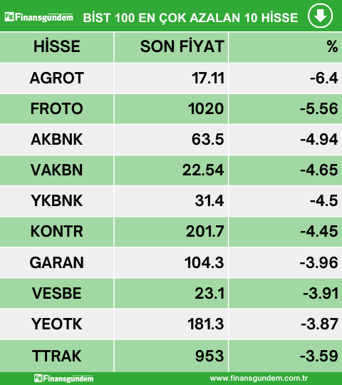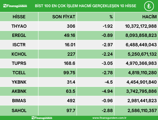 Borsa İstanbul endeks 100 de işlem gören hisselerden en çok artan, en çok azalan ve en çok işlem hacmi gerçekleşen 10 hisse şöyle: