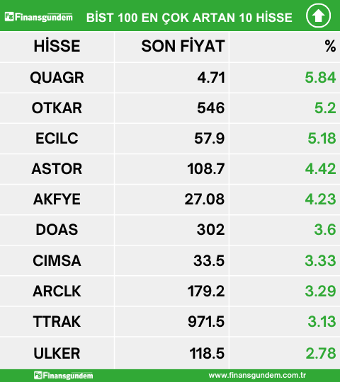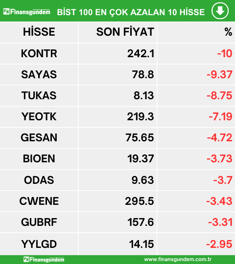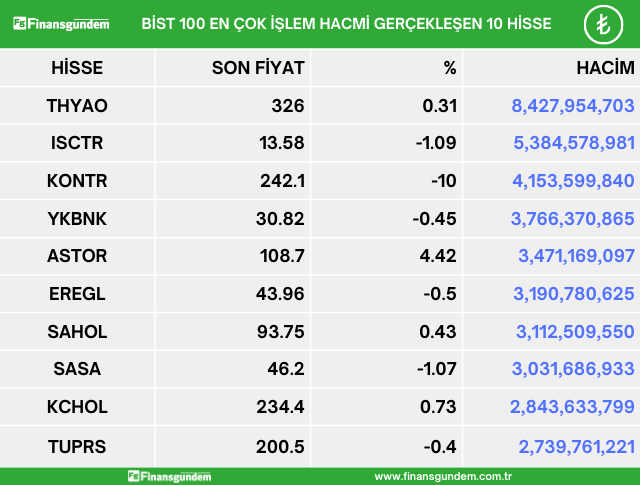Borsa İstanbul endeks 100 de işlem gören hisselerden en çok artan, en çok azalan ve en çok işlem hacmi gerçekleşen 10 hisse şöyle: