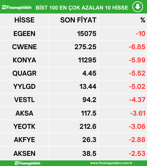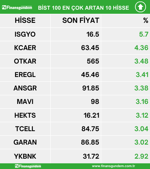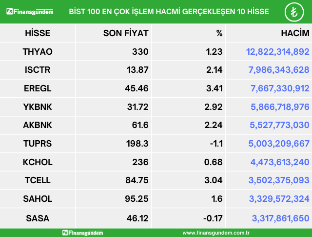 Borsa İstanbul endeks 100 de işlem gören hisselerden en çok artan, en çok azalan ve en çok işlem hacmi gerçekleşen 10 hisse şöyle: