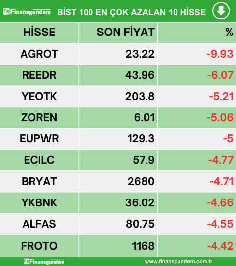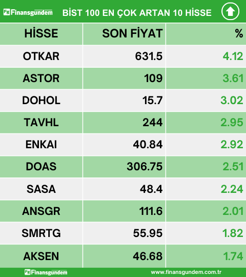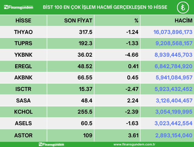 Borsa İstanbul endeks 100 de işlem gören hisselerden en çok artan, en çok azalan ve en çok işlem hacmi gerçekleşen 10 hisse şöyle: