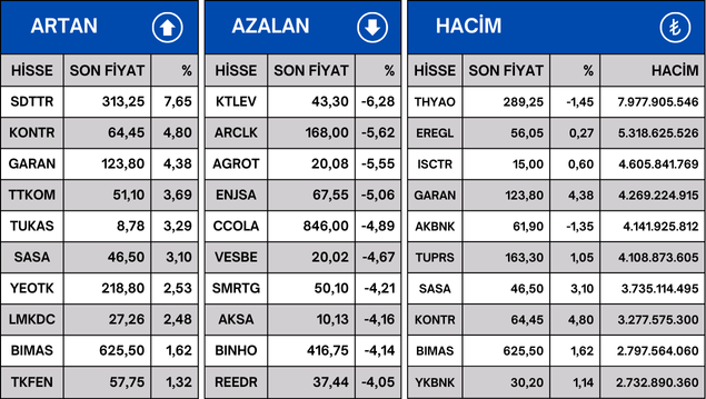 Borsa İstanbul’da endeks 100’de 31 Temmuz 2024 işlem gününde en çok artan, en çok azalan ve en çok işlem hacmi gerçekleşen 10 hisse şöyle: