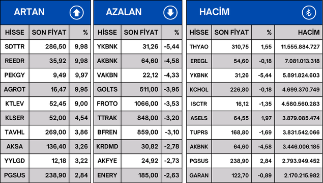 Borsa İstanbul endeks 100 de işlem gören hisselerden en çok artan, en çok azalan ve en çok işlem hacmi gerçekleşen 10 hisse şöyle: