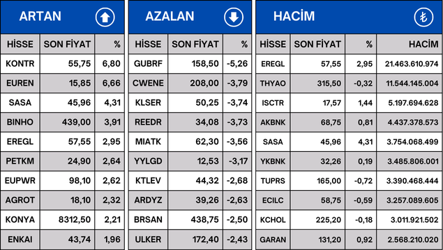 Borsa İstanbul’da endeks 100’de 19 Temmuz 2024 işlem gününde en çok artan, en çok azalan ve en çok işlem hacmi gerçekleşen 10 hisse şöyle: