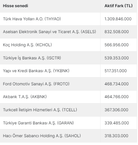 Bugün BİST100 endeksinde aktif alış satışlarda aktif fark +4.914.669.000 TL olurken, BİST30 endeksinde ise +6.198.521.000 TL aktif fark meydana geldi. Tüm hisselerde ise +2.409.628.000 TL aktif işlem farkı oldu. BİST100 endeksi günü %2,07 yükselişle geride bırakırken aktif işlem farkı pozitif olan bazı hisseler dikkat çekti.