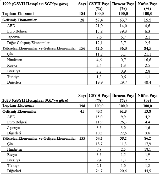 1999 ve 2023 yıllarının dünya ekonomik görünümünü karşılaştırdığımızda dikkat çeken konuları sıralayalım: (1) Özellikle Sovyet blokunun dağılmasıyla birlikte IMF’ye yeni üyeler girmesiyle üye sayısı 184’den 196’ya yükselmiş bulunuyor. (2) Gelişmiş ekonomi sayısı 28’den 41’e yükselmiş bulunuyor. (3) Gelişmiş ekonomilerin dünyadaki ağırlığı azalırken gelişmekte olan ekonomilerin ağırlığı artıyor. Örneğin dünya toplam GSYH’si içinde gelişmiş ekonomilerin payı 1999’da yüzde 57,4 ve toplam ihracattaki payı yüzde 63,7 iken bunlar 2023’de sırasıyla yüzde 40,7 ve yüzde 61,8’e gerilemiş bulunuyor. (4) Bugün batı dünyasının lideri konumunda bulunan ABD zemin kaybederken doğru dünyasının liderliğine oturmuş görünen Çin ciddi biçimde zemin kazanıyor. (5) Gelişmekte olan ülkeler arasında zemin kazanan bir başka ülke Hindistan. O da Çin gibi hızla dünya sahnesine ağırlığını koyuyor. Rusya ve Türkiye de onları izliyor.