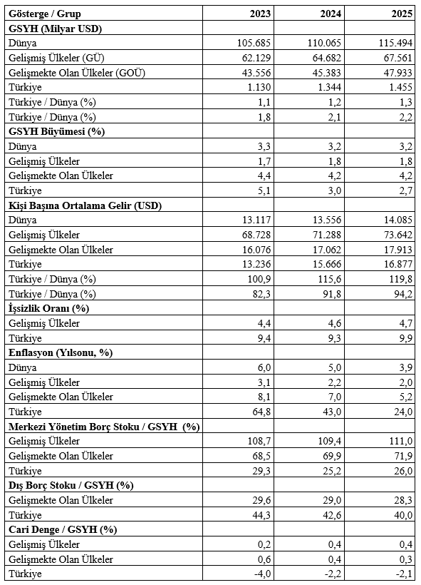 Aşağıdaki tabloda dünya, gelişmiş ülkeler, gelişmekte olan ülkeler ve Türkiye’ye ilişkin başlıca ekonomik göstergelerin 2023 yılı kesin sonuçları ile 2024 ve 2025 yılı tahminleri yer alıyor: