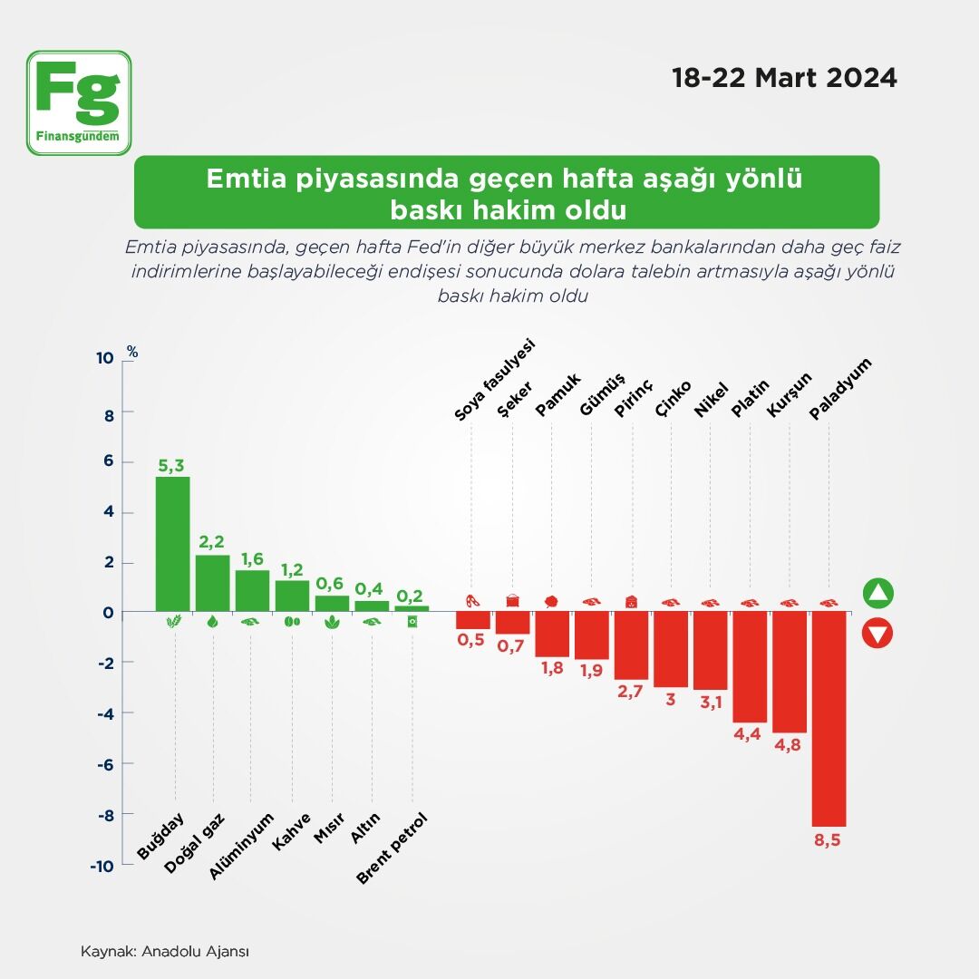 Emtia piyasasında, geçen hafta ABD Merkez Bankası’nın (Fed) diğer büyük merkez bankalarından daha geç faiz indirimlerine başlayabileceği endişesi sonucunda dolara talebin artmasıyla aşağı yönlü baskı hakim oldu.