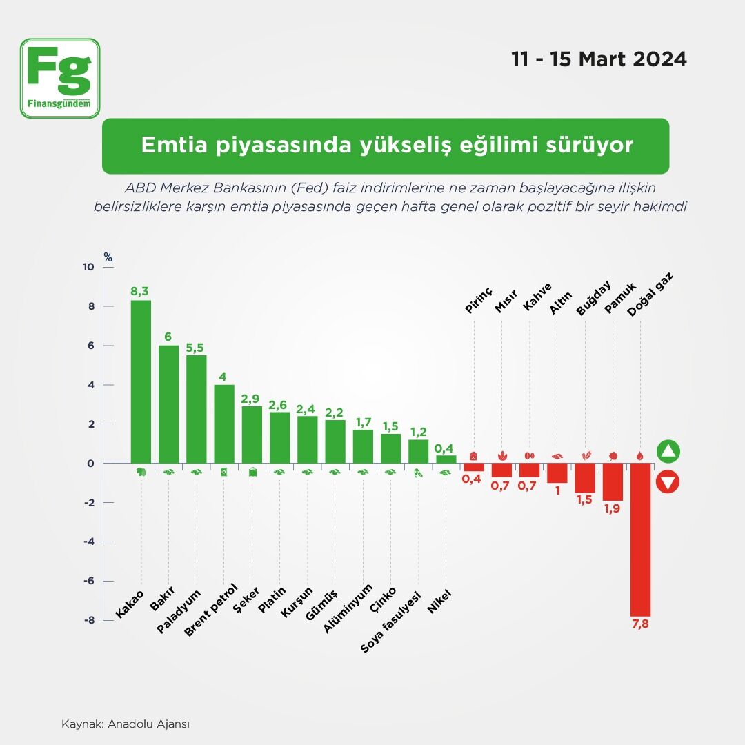 ABD Merkez Bankasının (Fed) faiz indirimlerine ne zaman başlayacağına ilişkin belirsizliklere karşın emtia piyasasında geçen hafta genel olarak pozitif bir seyir hakimdi.