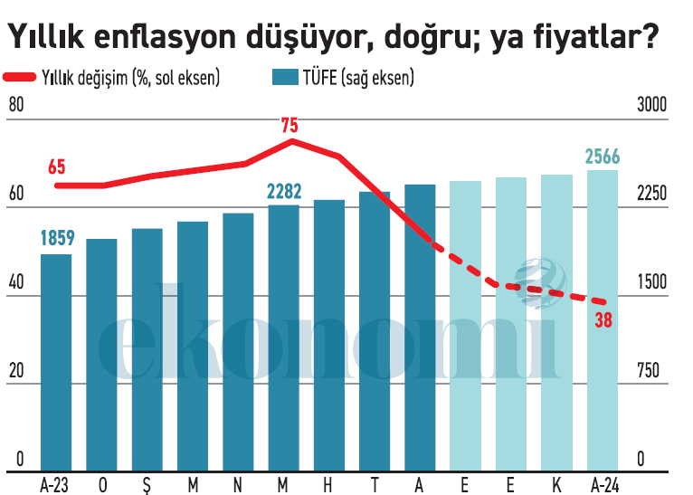 38 de olmayacakBu arada 2024’ün enflasyonunu yüzde 38’e indirmek de mümkün olmayacak. İlk sekiz ayda yüzde 32’ye yaklaşan artıştan sonra son dört ay için yüzde 4.5’lik bir hareket alanı kaldı. Dört ayda yüzde 4.5’i aşmamak aylık artışı yüzde 1.13’te tutmakla mümkün. Bu da olmayacak.