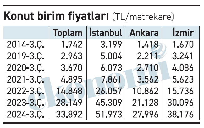 Merkez Bankası’nın hesaplamalarına göre üçüncü çeyrekler itibarıyla 2014’ten 2019’a kadar olan beş yılda konut birim fiyatlarında Türkiye ortalamasında yüzde 70 artış oldu.