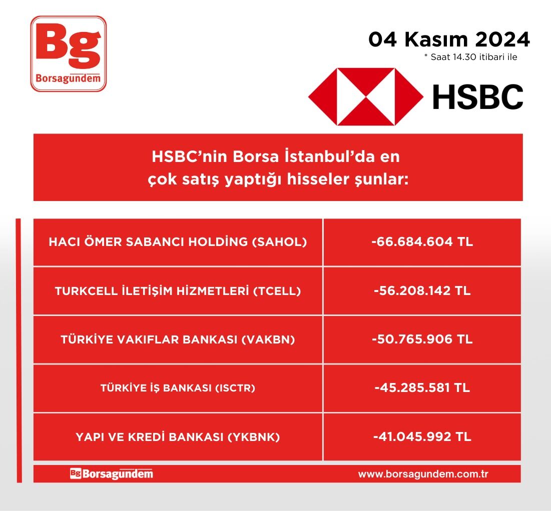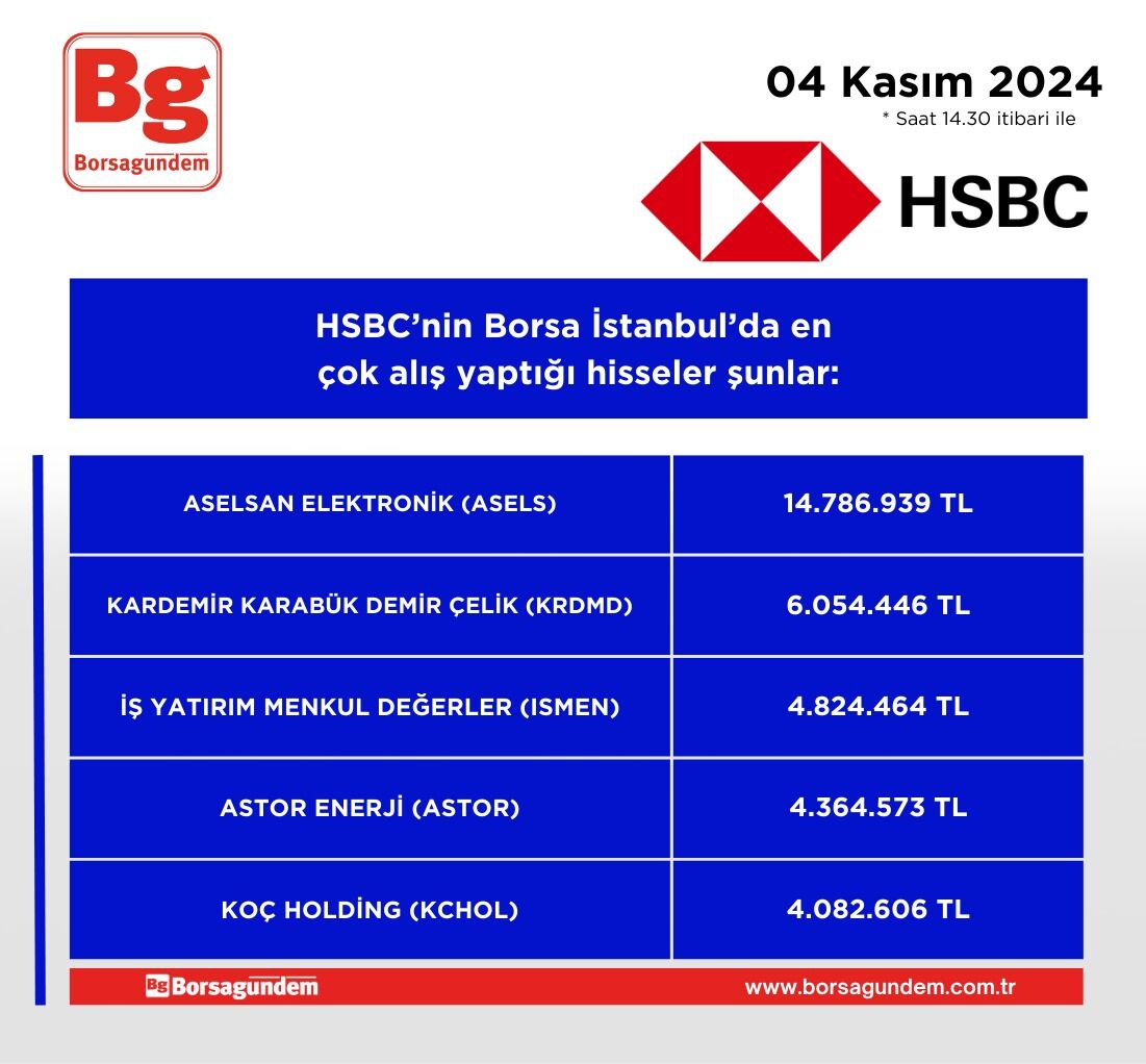 HSBC'nin en çok alım satım yaptığı hisseler (14.30 itibariyle)