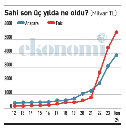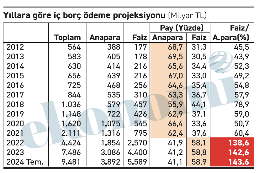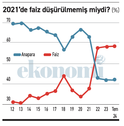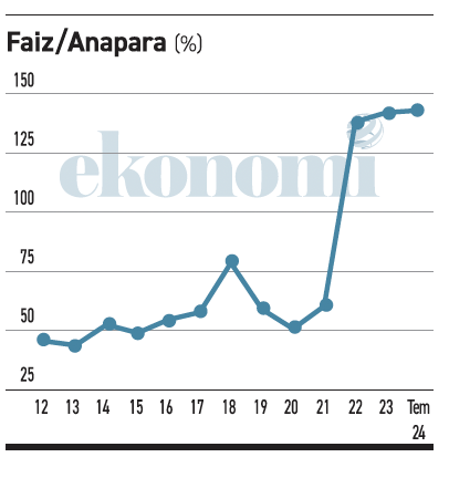 2012-2021 döneminde yüzde 64’e yüzde 36 olan anapara-faiz dengesi, 2022-2024 (temmuz) döneminde yüzde 41’e yüzde 59 olarak değişiyor.