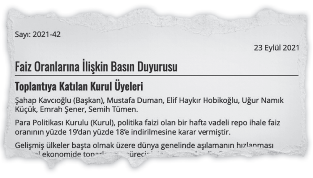 Ama o da ne! Para Politikası Kurulu’nun 23 Eylül 2021 tarihindeki toplantısından bir puanlık faiz indirimi kararı çıkıyor. Politika faizi yüzde 19’dan yüzde 18’e indiriliyor.