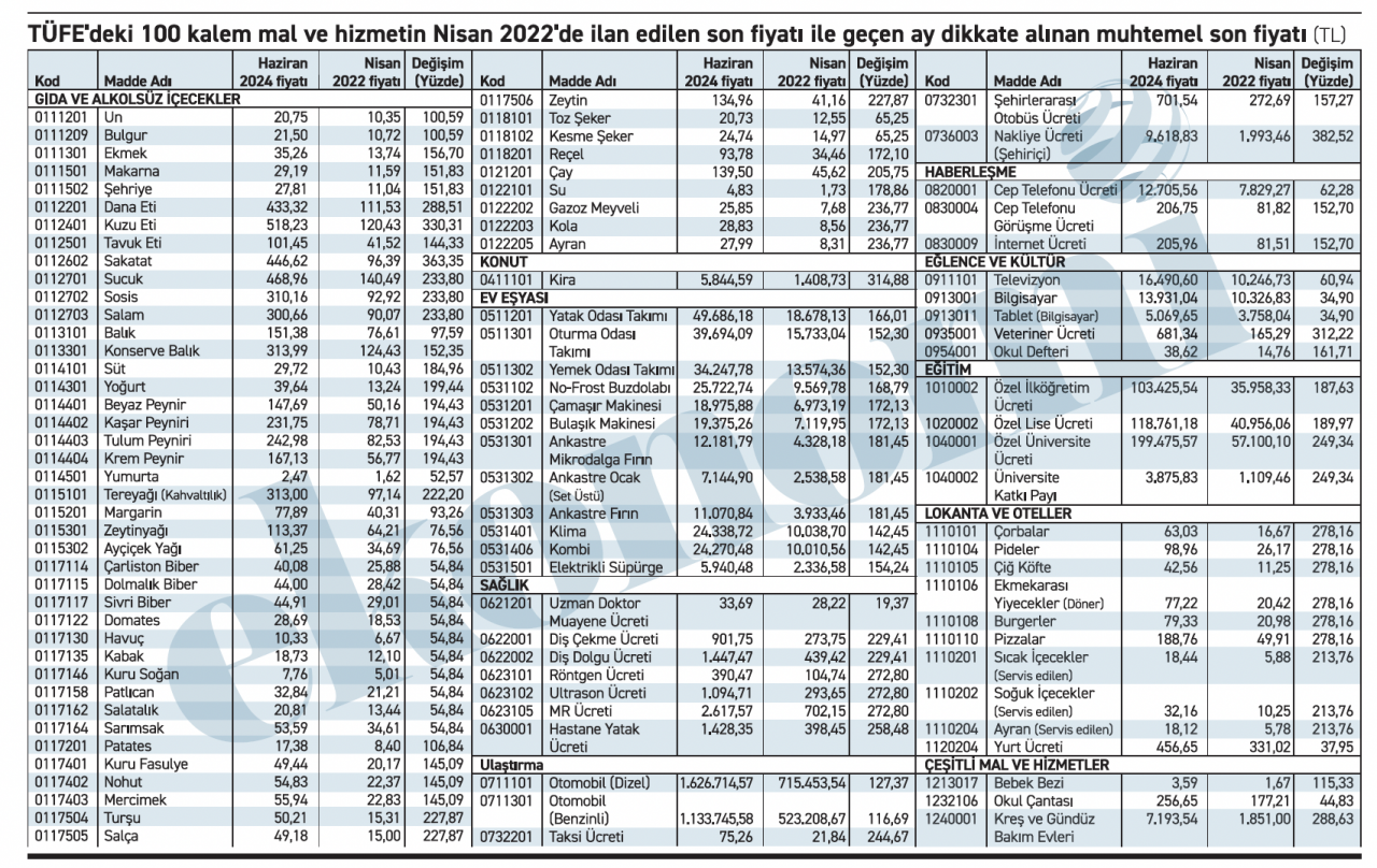 Bu oran doğrudur, değildir; bugün onunla fazla ilgilenmiyorum. Varmak istediğim, başlıca kalemlerin Haziran 2024 itibarıyla hangi fiyattan endekse dahil edildiği. Dolayısıyla peşin peşin söyleyeyim; “Ama TÜİK artışı düşük gösteriyor” gibi gerekçeleri bu yazı özelinde bırakın; konu artış oranının doğru olup olmadığından çok son fiyatın gerçekçi olup olmadığı.Yazımda kapsamlı bir tablo var. Bu tablo için tüketimde önemli payı bulunan 100 kalem mal ve hizmet seçtim. Bunların Nisan 2022’de TÜİK tarafından ilan edilen ve Haziran 2024’te dikkate alınan fiyatlarına yer veriyorum. Geçen ayki fiyatlar bazı kalemlerde TÜİK’in enflasyon hesabındaki fiyatlara göre artı-eksi en fazla yüzde 10 oynayabilir.