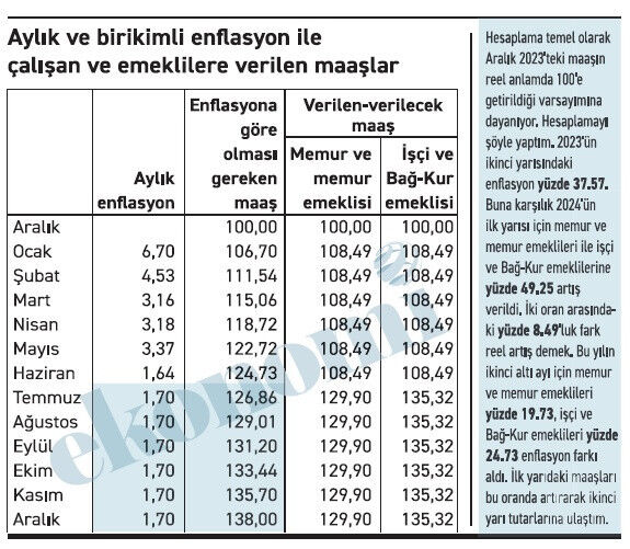 Memur yalnızca üç ay avantajlıBu hesaplama yalnızca 2024 yılındaki maaşın 2024’ün enflasyonuyla kıyaslanmasından ibaret. Çalışanların ve emeklilerin önceki yıllardan hiç kaybının olmadığını varsayıyorum. Kesinlikle kayıp var da, olmadığını varsayıyorum.
