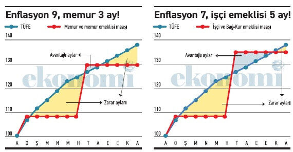 Buna göre memur yılın yalnızca ocak, temmuz ve ağustos aylarında enflasyona göre daha yüksek maaş alabiliyor. Diğer dokuz ayda enflasyon daha yüksek.