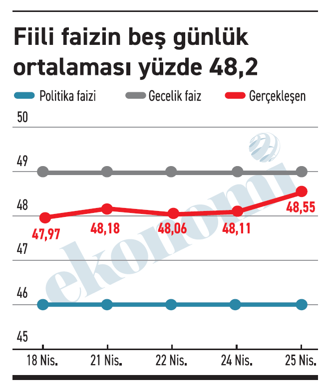 İşte grafikte görüyorsunuz... 18 Nisan’dan bu yana geçen sürede Merkez Bankası’nın ortalama fonlama maliyeti yüzde 48 dolayında oluşmuş. Beş günün ortalaması yüzde 48,20 düzeyinde.