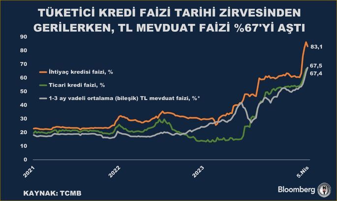 1-3 aylık TL mevduat faizi yüzde yüzde 64,3'ten yüzde 67,4'e çıkarken ticari kredi faizleri de yüzde 66,3'ten yüzde 67,5'e yükseldi.