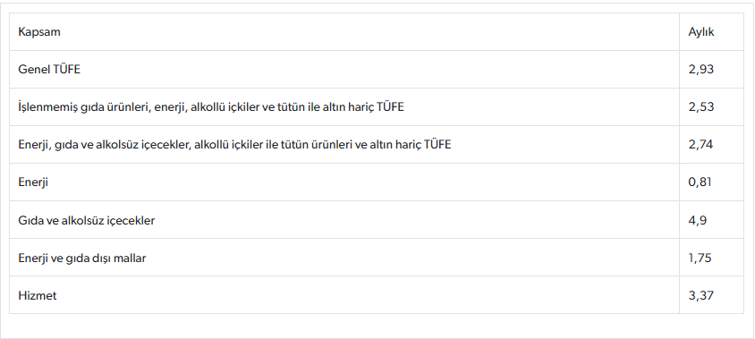 Bu dönemde işlenmemiş gıda ürünleri, enerji, alkollü içkiler ve tütün ile altın hariç TÜFE yüzde 2,53, enerji, gıda ve alkolsüz içecekler, alkollü içkiler ile tütün ürünleri ve altın hariç TÜFE yüzde 2,74 artış kaydetti.