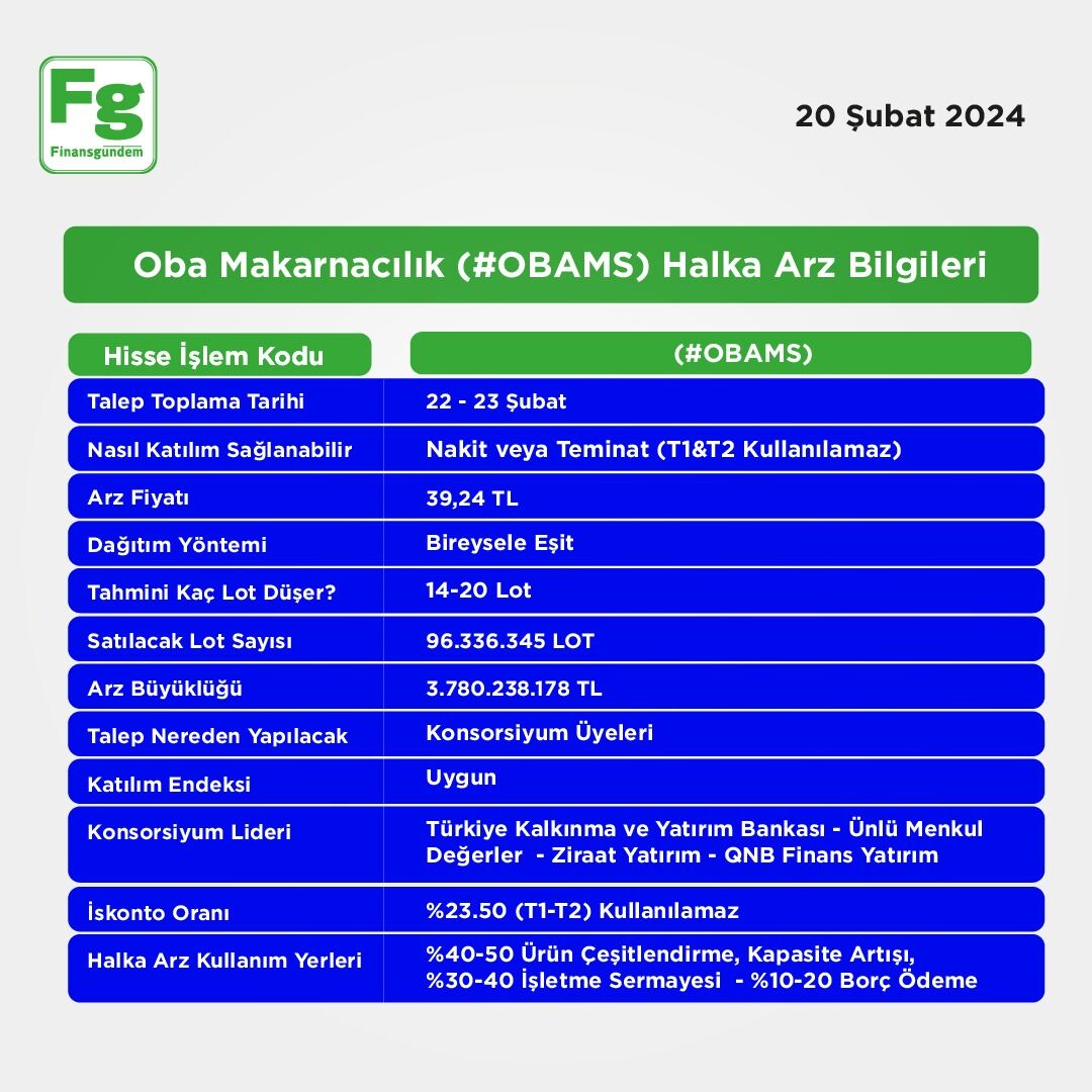 Oba Makarnacılık (#OBAMS) Halka Arz Bilgileri