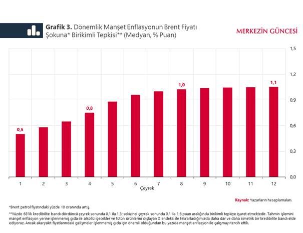 Ham petrol fiyatlarının manşet enflasyon üzerindeki etkisini ölçmek için Bayesçi yöntemle bir Vektör Ardışık Bağlanım (VAR) model tahmin ediyoruz.[2] Bulgularımız, ham petrol fiyatında yüzde 10’luk bir artışın tüketici enflasyonunu nihai olarak 1 puan artırdığına işaret ediyor. Toplam etkinin yaklaşık yarısı ilk çeyrekte gerçekleşirken, bir yılın sonunda yaklaşık 0,8 puanlık bir etki söz konusu (Grafik 3).