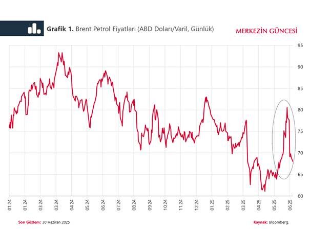 Son dönemde artan jeopolitik gerilimler nedeniyle ham petrol fiyatlarının ülke ekonomilerine etkileri yeniden gündeme geldi. Mayıs ayı başında 60 ABD dolarına kadar gerilemiş olan Brent petrol varil fiyatı yaşanan gelişmelerin ardından hızlı bir şekilde artarak 80 ABD doları seviyelerine yaklaştı. Uluslararası fiyatlar gerginliklerin azalmasıyla birlikte yeniden gerilemiş olsa da önceki döneme kıyasla daha yüksek bir seviyeye yerleşmiş görünüyor (Grafik 1). Tedarik sürecinin kesintiye uğrama ihtimali eşliğinde fiyatlarda yaşanan artışın büyüklüğü, ham petrol fiyatlarının olası etkilerini yeniden gözden geçirmeyi gerekli kılıyor. Bu blog yazısında ham petrol fiyatlarında gerçekleşebilecek artışların Türkiye ekonomisi özelinde enflasyon ve cari denge üzerindeki tahminî etkilerini sayısallaştırıyoruz.