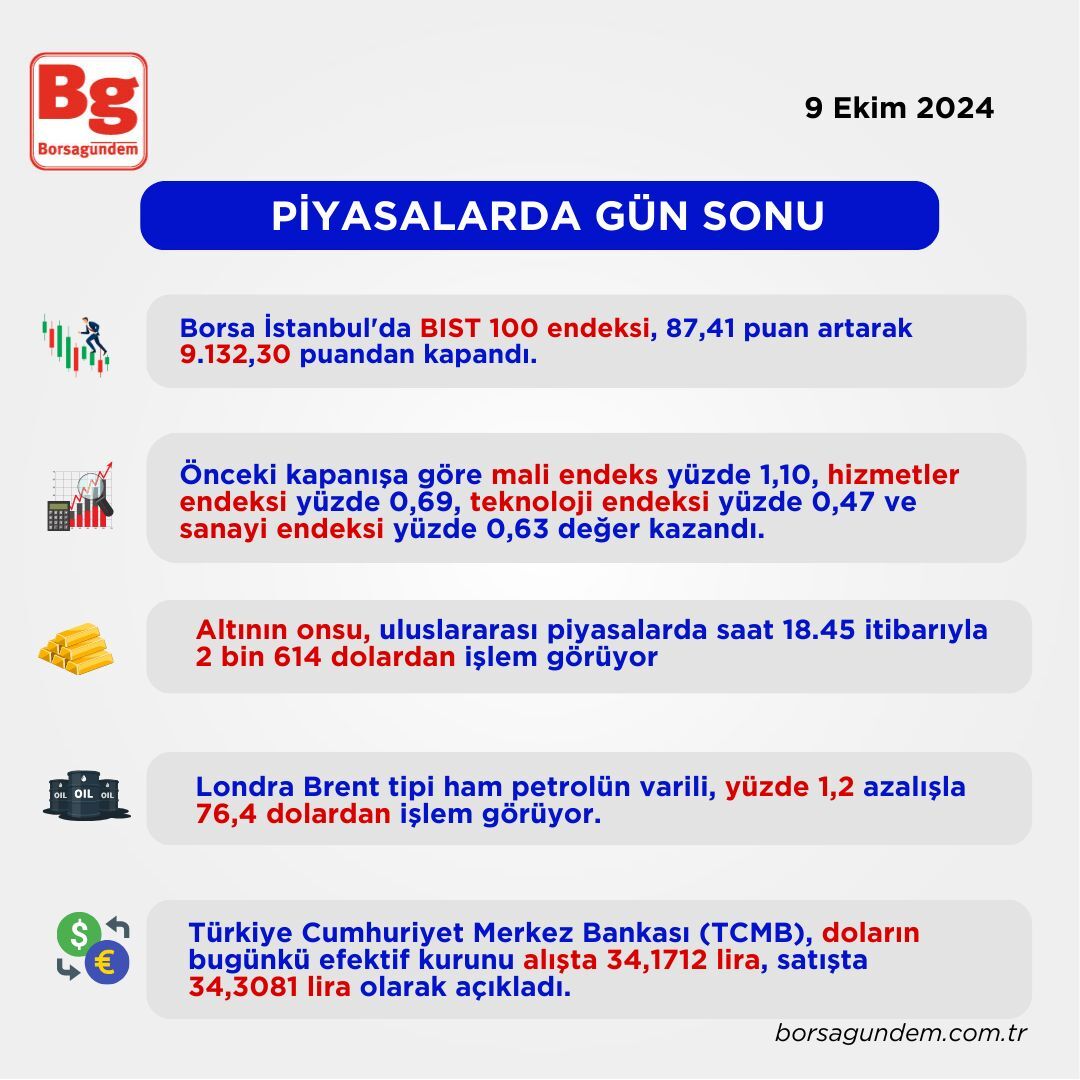 Borsa İstanbul'da BIST 100 endeksi, 87,41 puan artarak 9.132,30 puandan kapandı.