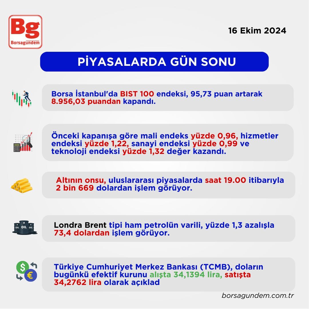 Borsa İstanbul'da BIST 100 endeksi, 95,73 puan artarak 8.956,03 puandan kapandı.