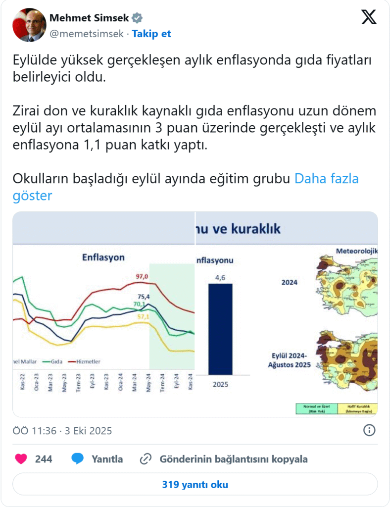 Bakan Şimşek, Eylül ayında yüksek gerçekleşen aylık enflasyonda gıda fiyatlarının belirleyici olduğunu ifade etti. Gıda fiyatlarındaki yükselişin nedenlerine değinen Şimşek, "Zirai don ve kuraklık kaynaklı gıda enflasyonu uzun dönem [Eylül] ayı ortalamasınınü3 puan üzerinde gerçekleşti ve aylık enflasyona 1,1 puan katkı yaptı" dedi.