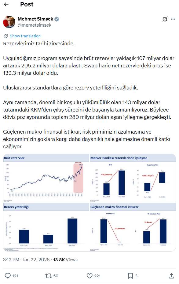 Hazine ve Maliye Bakanı Mehmet Şimşek, sosyal medya hesabından yaptığı paylaşımda brüt rezervlerin 205,2 milyar dolara yükseldiğini, swap hariç net rezervlerde 139,3 milyar dolarlık artış sağlandığını ve KKM’den çıkış sürecinin başarıyla tamamlanma aşamasına geldiğini belirtti.