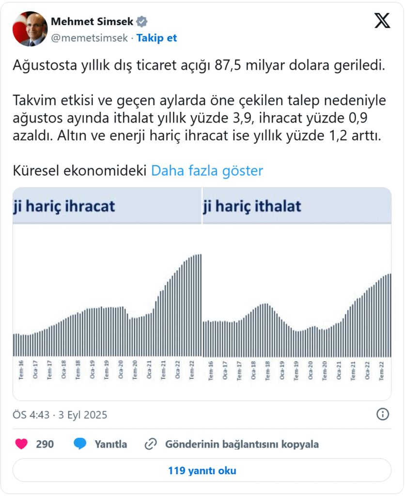 Şimşek, NSosyal hesabından yaptığı paylaşımda, ağustos ayı dış ticaret verilerini değerlendirdi.