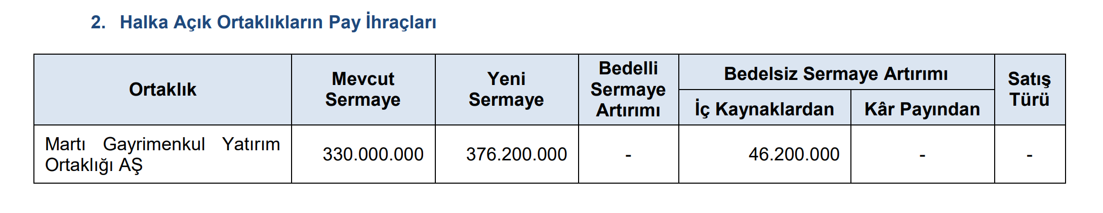 Sermaye Piyasası Kurulu (SPK) 2024-14 numaralı bülteni yayımlandı. Yayımlanan bültende Martı Gayrimenkul Yatırım Ortaklığı AŞ’nin (MRGYO) %14 bedelsiz sermaye artırımına onay verildiği kamuoyuna duyuruldu.