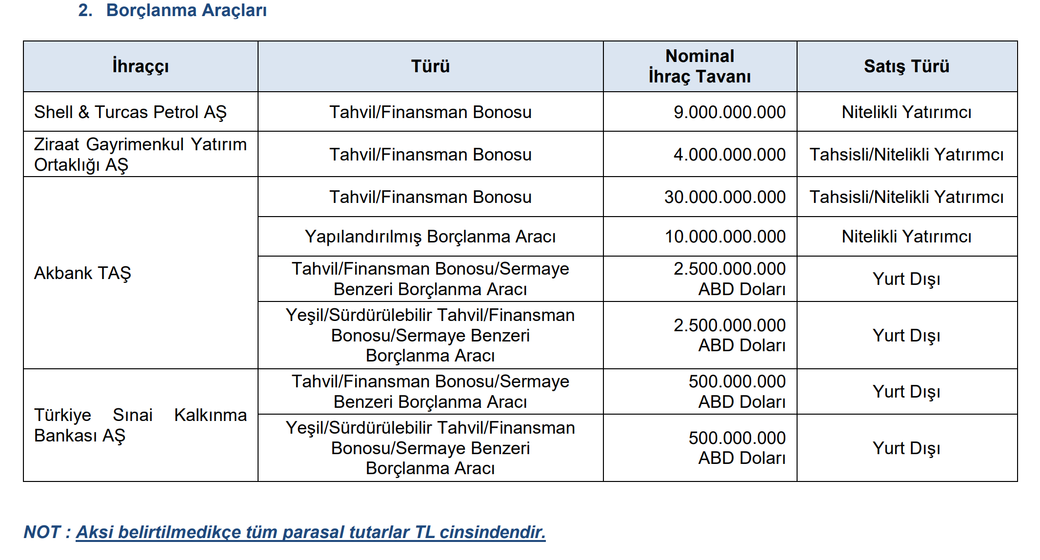 Sermaye Piyasası Kurulu’nun (SPK) 2024-50 numaralı bülteni yayımlandı. SPK dört şirketin borçlanma aracı ihracına onay verdi. Sermaye Piyasası Kurulu’nun  borçlanma aracı ihracı izinlerinin detayları şöyle: