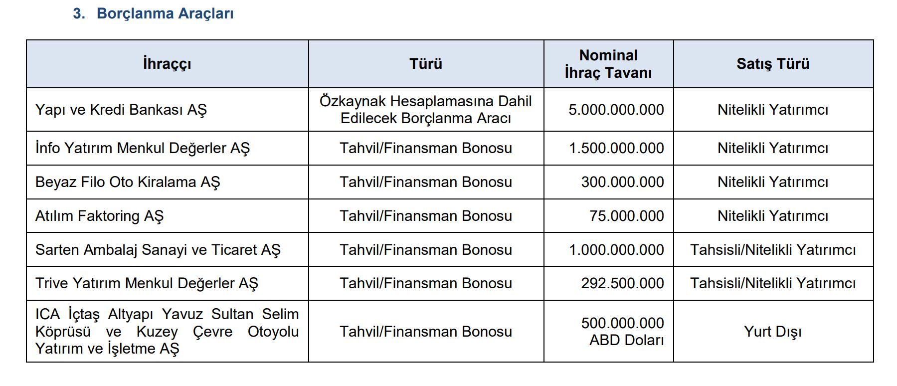 Yapı ve Kredi Bankası AŞ‘nin 5 milyar lira, İnfo Yatırım Menkul Değerler AŞ‘nin 1 milyar 500 milyon lira, Beyaz Filo Oto Kiralama AŞ‘nin 300 milyon lira, Atılım Faktoring AŞ‘nin 75 milyon lira, Sarten Ambalaj Sanayi ve Ticaret AŞ‘nin 1 milyar lira, Trive Yatırım Menkul Değerler AŞ‘nin 292 milyon 500 bin lira ve ICA İçtaş Altyapı Yavuz Sultan Selim Köprüsü ve Kuzey Çevre Otoyolu Yatırım ve İşletme AŞ‘nin 500 milyon ABD Doları tutarındaki borçlanma aracı ihracı başvurusuna onay verdi.ü