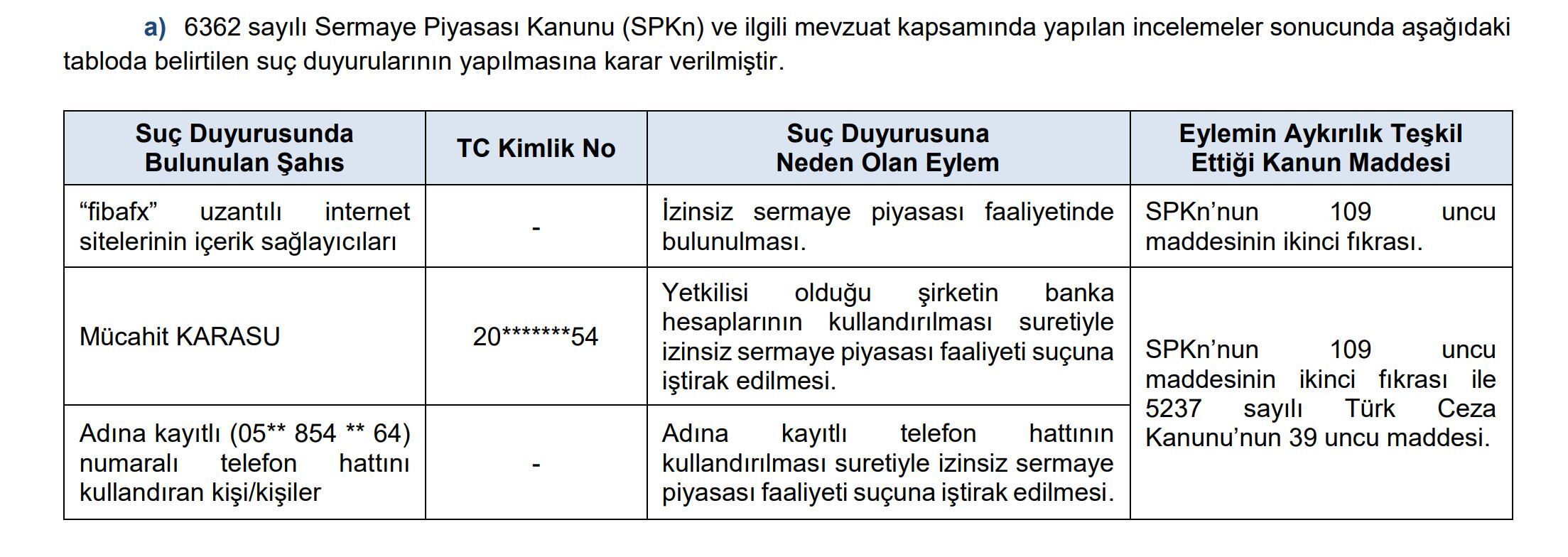 3- Adına kayıtlı (05** 854 ** 64) numaralı telefon hattını kullandıran kişi/kişiler hakkında, adına kayıtlı telefon hattının kullandırılması suretiyle izinsiz sermaye piyasası faaliyeti suçuna iştirak edilmesi nedeni ile SPKn’nun 109 uncu maddesinin ikinci fıkrası ile 5237 sayılı Türk Ceza Adına kayıtlı Kanunu’nun 39 uncu maddesine dayanılarak suç duyurularında bulunulmasına karar verilmiştir.