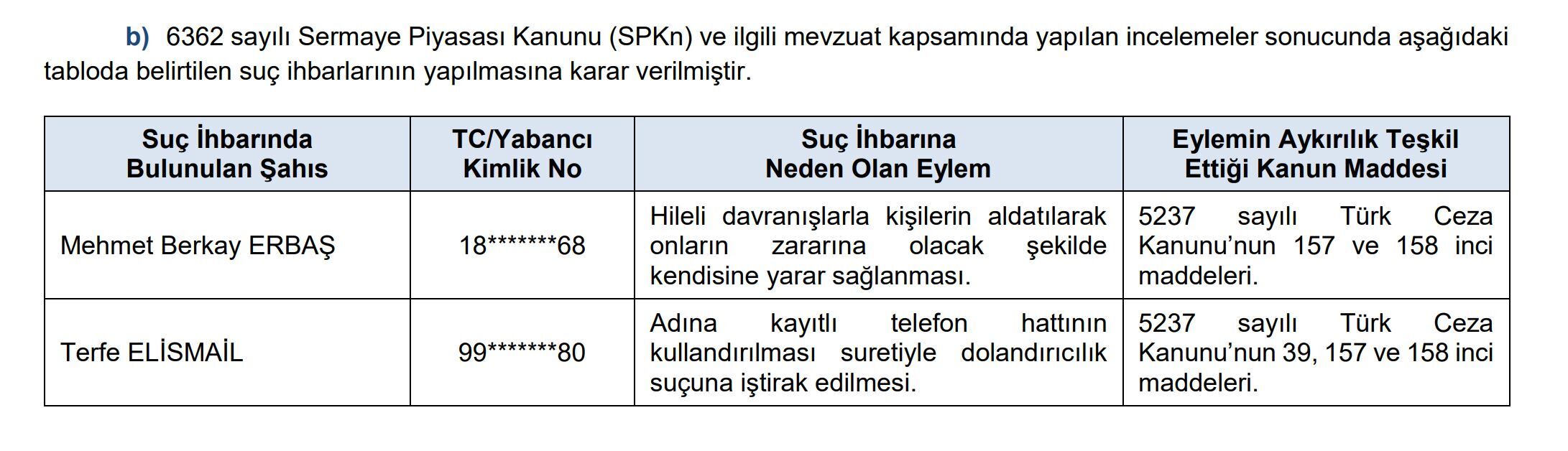 SPK tarafından kamuoyu ile paylaşılan suç ihbarları ise şöyle: