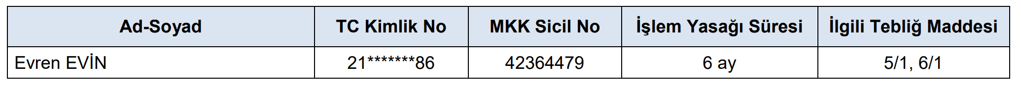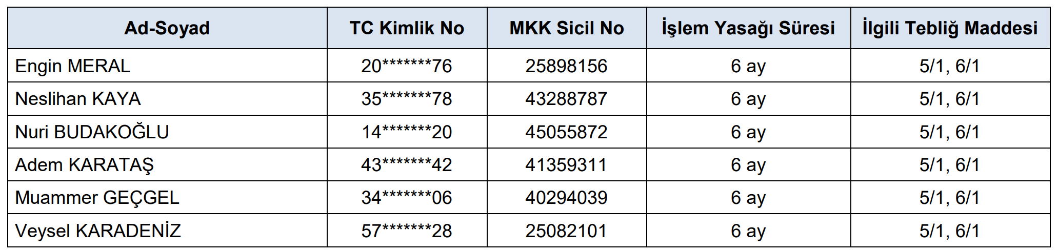 SPKn’nun 1 inci maddesi çerçevesinde yatırımcıların hak ve yararlarının korunmasını teminen, SPKn’nun 128/1-(a) maddesine dayanarak yapay piyasa oluşturmaya yönelik işlemlerin engellenmesi amacıyla; SPKn’nun 101/1 maddesi ve V-101.1 sayılı Bilgi Suistimali ve Piyasa Dolandırıcılığı İncelemelerinde Uygulanacak Tedbirler Tebliği’nin 5/1 ve 6/1 maddeleri uyarınca; aşağıdaki tablolarda bilgilerine yer verilen kişiler hakkında 22.04.2024 tarihli işlemlerden başlamak üzere borsalarda 6 ay süreyle geçici işlem