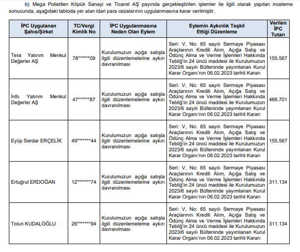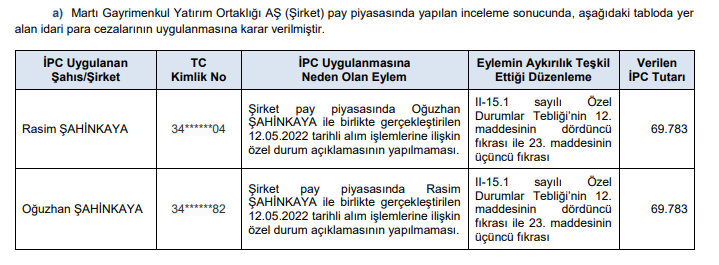 Buna göre; SPK tarafından yapılan incelemeler sonucunda, aşağıdaki tabloda yer alan kişi ve kurumlar hakkında idari para cezalarının uygulanmasına karar verildi.ü