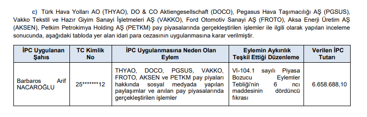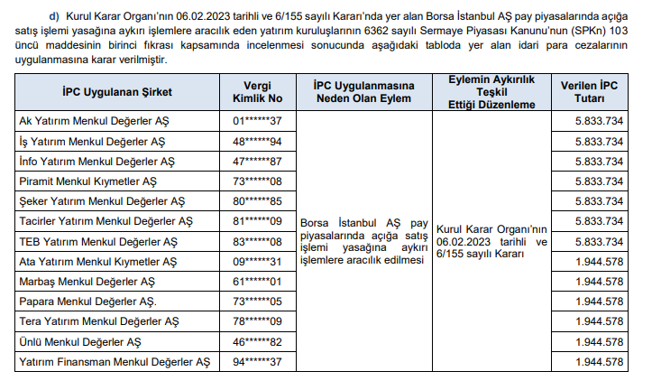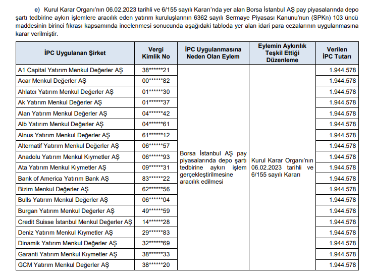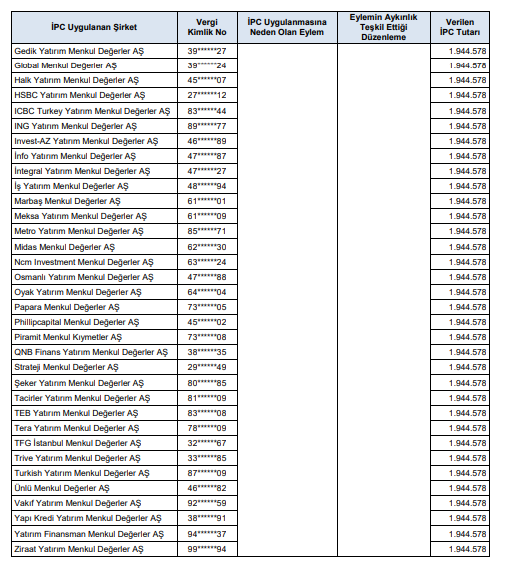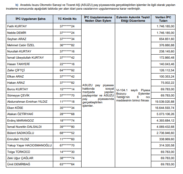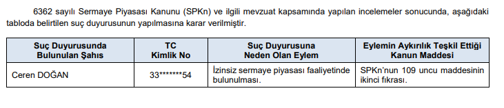 Buna göre; SPK tarafından yapılan incelemeler sonucunda, aşağıdaki tabloda yer alan kişi ve kurumlar hakkında suç duyurusu yapılmasına karar verildi.