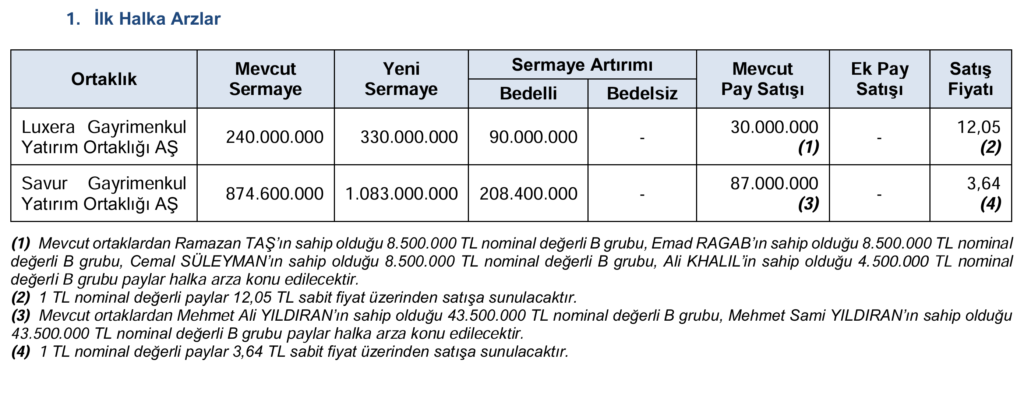 Savur Gayrimenkul Yatırım Ortaklığı A.Ş. tarafında ise şirketin 874.600.000 TL olan mevcut sermayesi, 208.400.000 TL bedelli sermaye artırımı ile 1.083.000.000 TL’ye yükseltilecek. Halka arz kapsamında mevcut ortaklara ait 87.000.000 TL nominal değerli payların satışı da planlanıyor. Halka arzda 1 TL nominal değerli paylar 3,64 TL sabit fiyattan yatırımcılara sunulacak; bu kapsamda yine tüm payların satılması halinde toplam halka arz büyüklüğünün yaklaşık 1,08 milyar TL seviyesinde gerçekleşmesi öngörülüyor.